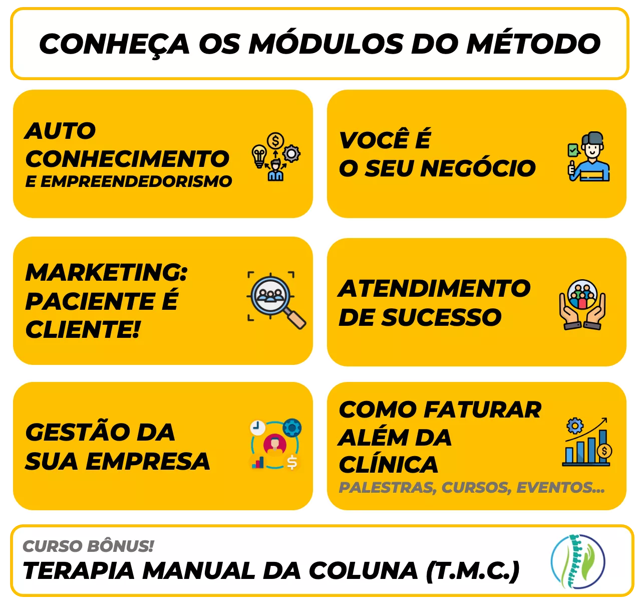 Com o TMC (Terapia Manual da Coluna) você aprenderá as técnicas de manipulação corretas e terá mais um diferencial para atender seus pacientes e se tornar um Fisio10!